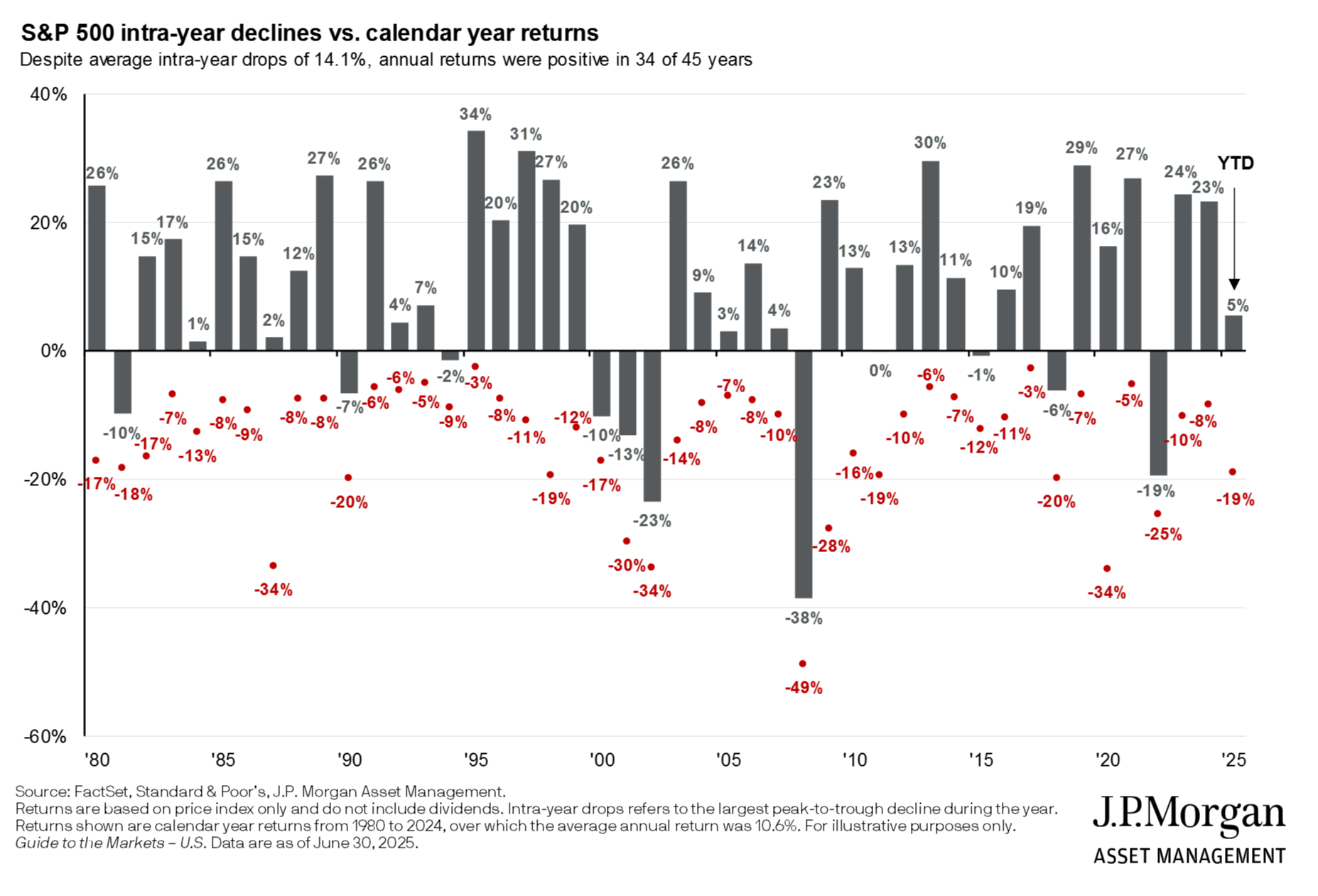 Historically, stocks have generally provided higher investment returns compared to bonds.1 However, stocks have also been the most volatile. Each calendar year, we may see a market correction – a 10% decline in the S&P 500 index, which is made up of stocks. While working and adding to your portfolio, you are more willing to accept this and might take advantage of these declines and buy more shares.